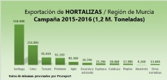 En hortalizas, con 1.222.896 toneladas exportadas, la Región de Murcia redujo en un 0,5% sus cantidades exportadas respecto a la campaña 2014-2015. Sin embargo, la Región incrementó un 3,6% el valor de sus exportaciones, llegando hasta 1.165,6 millones de euros (23,19% del total nacional). La recuperación de los valores de exportación se produjo a partir de febrero, pues hasta entonces la campaña marcó unos precios medios considerablemente bajos que obligaron a regular ciertas producciones en origen.