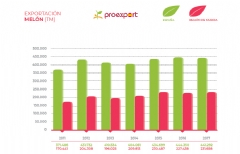 La exportación de melón por las empresas asociadas a PROEXPORT durante el año 2017, ascendió a 85.766tm, lo que representa el 19,4% del total nacional, cifra que aumenta al 37% cuando comparamos con la Región de Murcia.